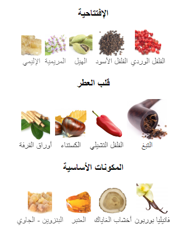 قاعدة العطر تتكون من خشب الغاياك، الجاوي، فانيليا بوربون و العنبر.