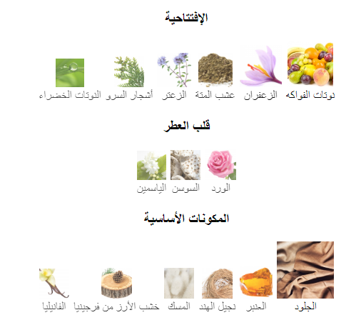 مكونات العطر : مقدمة العطر تحتوي اوراق السرو والزعفران مع الفواكه .. قلب العطر يحوي مزيج من الزهور والياسمين والسوسن .. قاعدة العطر تحوي رائحة الجلد والفيتفير وأخشاب الارز والعنبر فيه شبه من عطر توسكان ليذر توم فورد