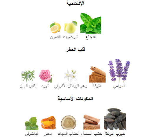 ويتبعها قلب التكوين برفقة الورد، قرفة، اكليل الجبل، زهر البرتقال والخزامى.