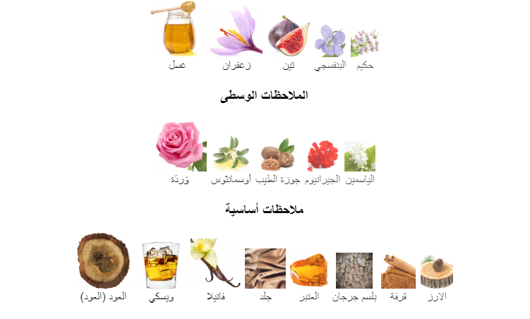 يشذو العطر بعبير عطري فواح ساحر يبدأ برفقة قمة عطرية مكللة بالإنتعاش مع التين، الزعفران، المرمية، البنفسج والعسل.