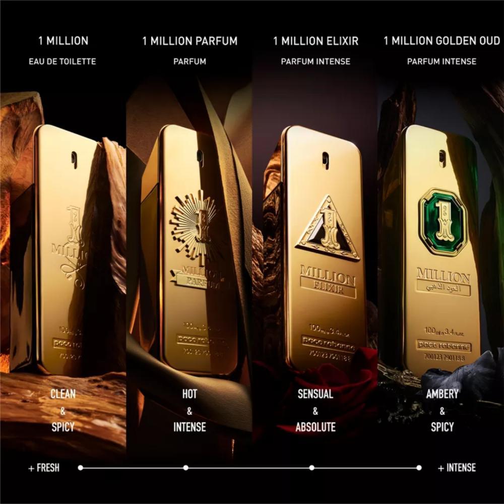 تم تصميم عطر One Million Golden Oud للرجال، وهو عطر قوي ومكثف للغاية. هذا العطر العنبري الخشبي مع نفحات أساسية من العود والسوسن وخشب الصندل مغلف في زجاجة ذهبية اللون تمثل تعبيرًا مكثفًا للرجل الراقي.